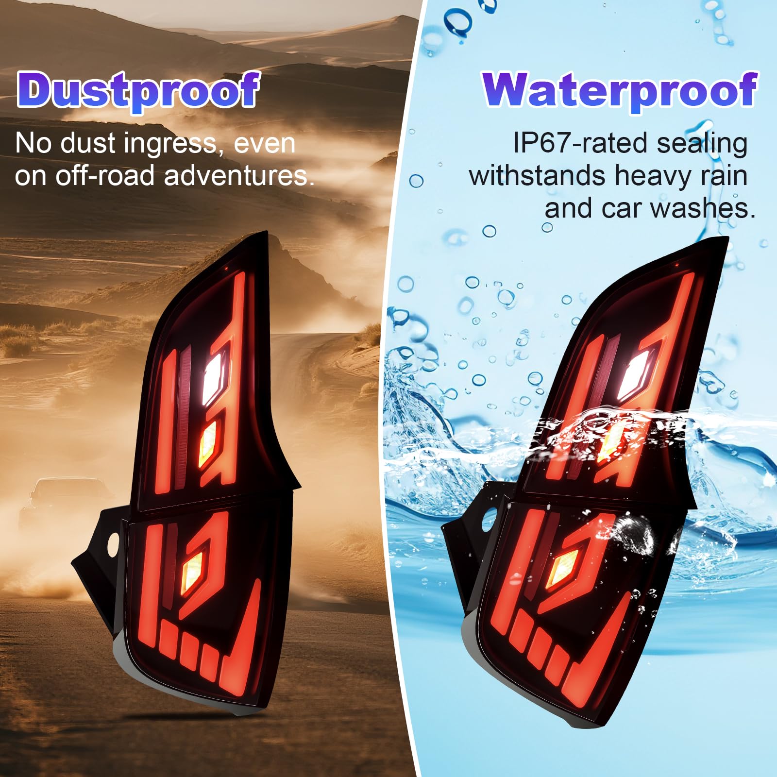 - Improve Safet: LED tail lights are made of high-quality polycarbonate housing, makes taillights durable; clear and red lens provide bright red color, and the sided safety reflector, make the tail lights easily visible when visibility is low due to rain, fog, or darkness, make your daily driving safer.